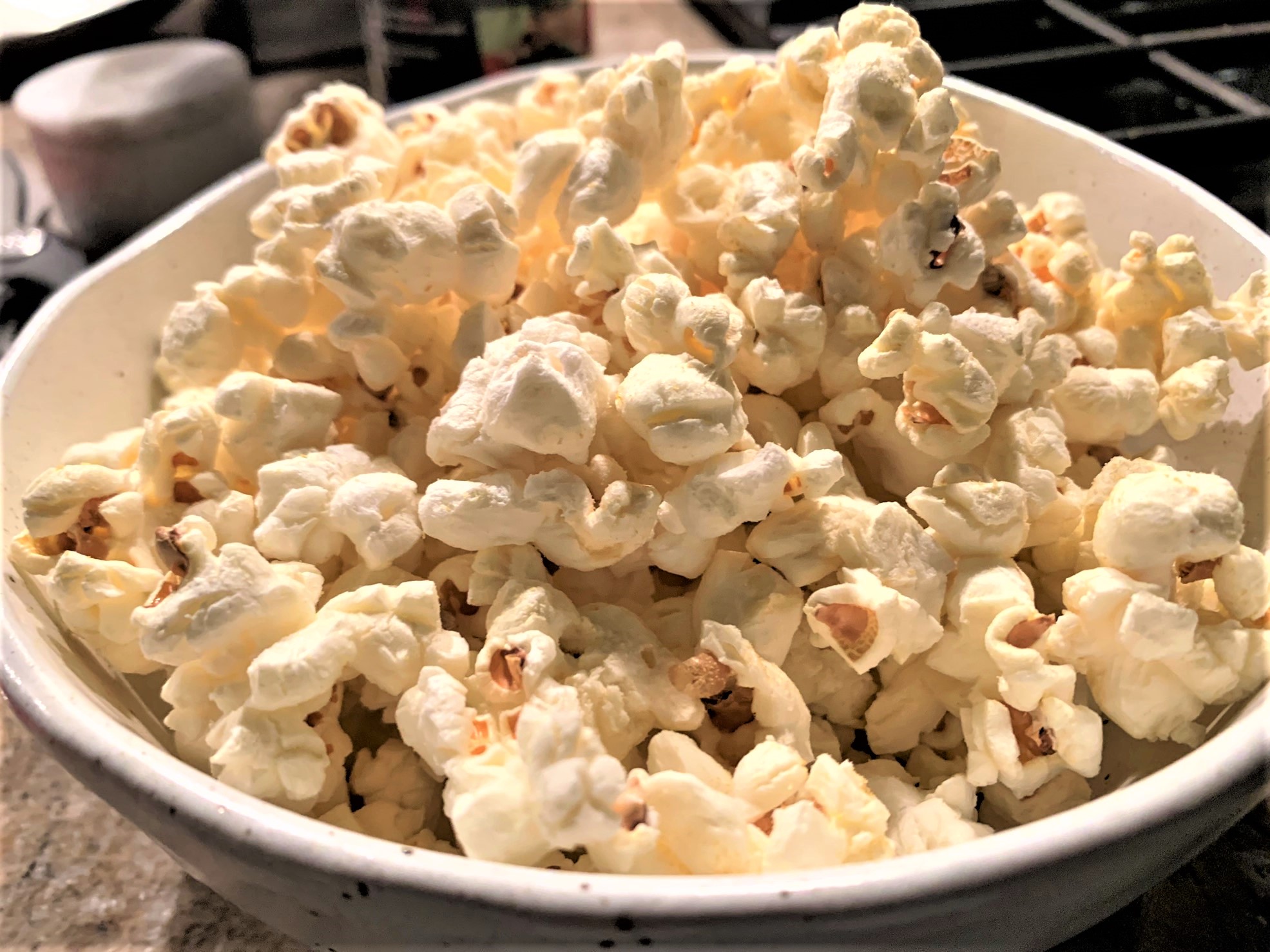 This recipe makes pretty large bowl of popcorn with very few un-popped kernels every time. Once you get the hang of it, you can scale up or down; just make sure that the oil coats the bottom of the pot and the kernels are in a single layer.