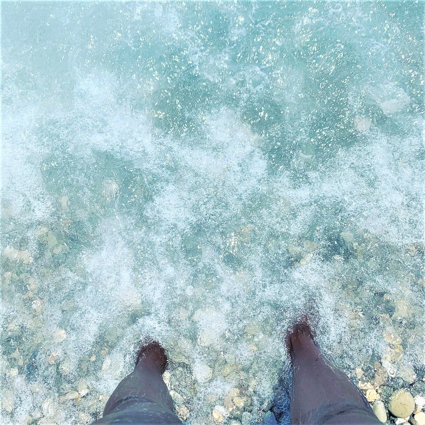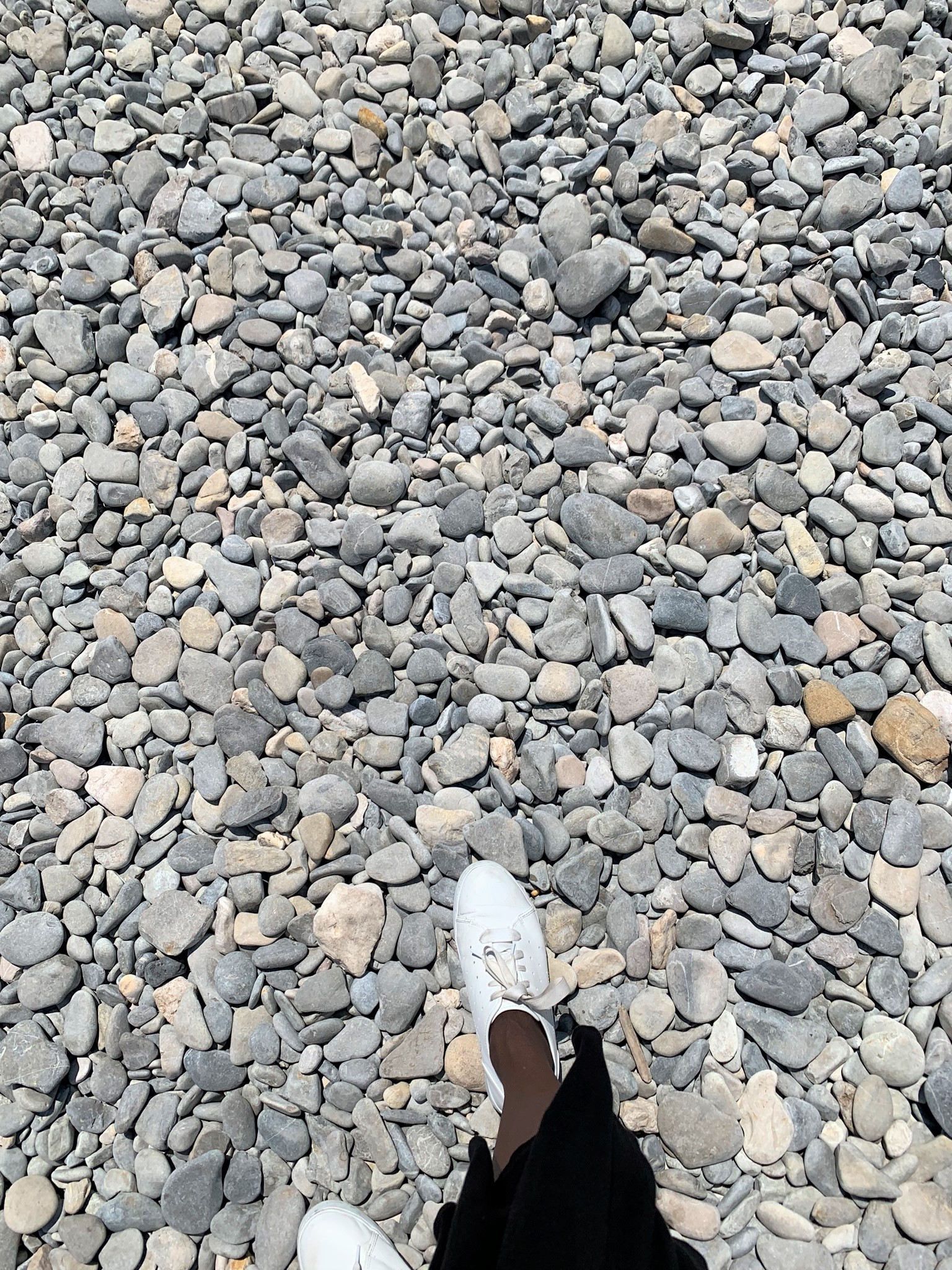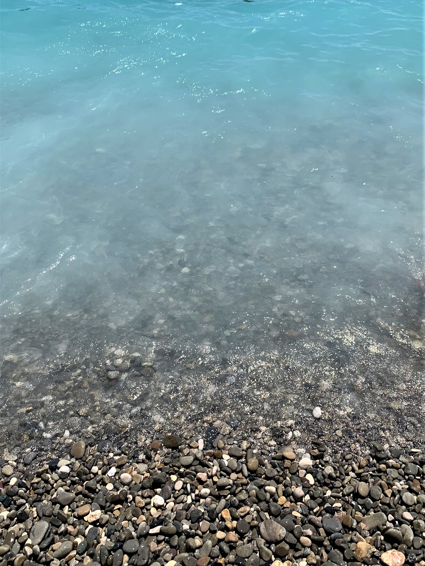I had no choice but to take off my orthotic sneakers and socks and did a little wading. People, those stones are intense. I thought I’d strike some equilibrium when walking and standing where the smooth curves of the stones would gently press on my feet but that is impossible. I, like nearly everyone else, hobbled around the laid out towels and umbrellas to the water -8 points.