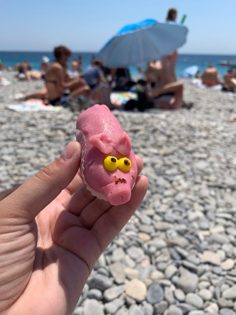 Fougasse is a French sister of Focaccia and comes in distinct sculpted shape. It can be studded with bacon, onions, olives or other flavors. Pissaladiere is a flatbread dough that’s covered with caramelized onions, black olives and traditionally anchovies. I actually remember watching Julia Child talking about it as a kid watching PBS. We got the orange blossom water fougasse and pissaladiere with anchovies at La Fougasserie, a wife and husband owned bakery using high quality ingredients and natural, slow fermentation techniques. There are many enticing pastries in this shop, so we scopped a couple others, including that marzipan pig (see below), and took our carbs to the beach. The Promenade Anglais along the Mediterranean and entrance to the beach is only a few steps away and stuffing our faces under a gentle sea breeze just seemed right. I think Julia would have approved.