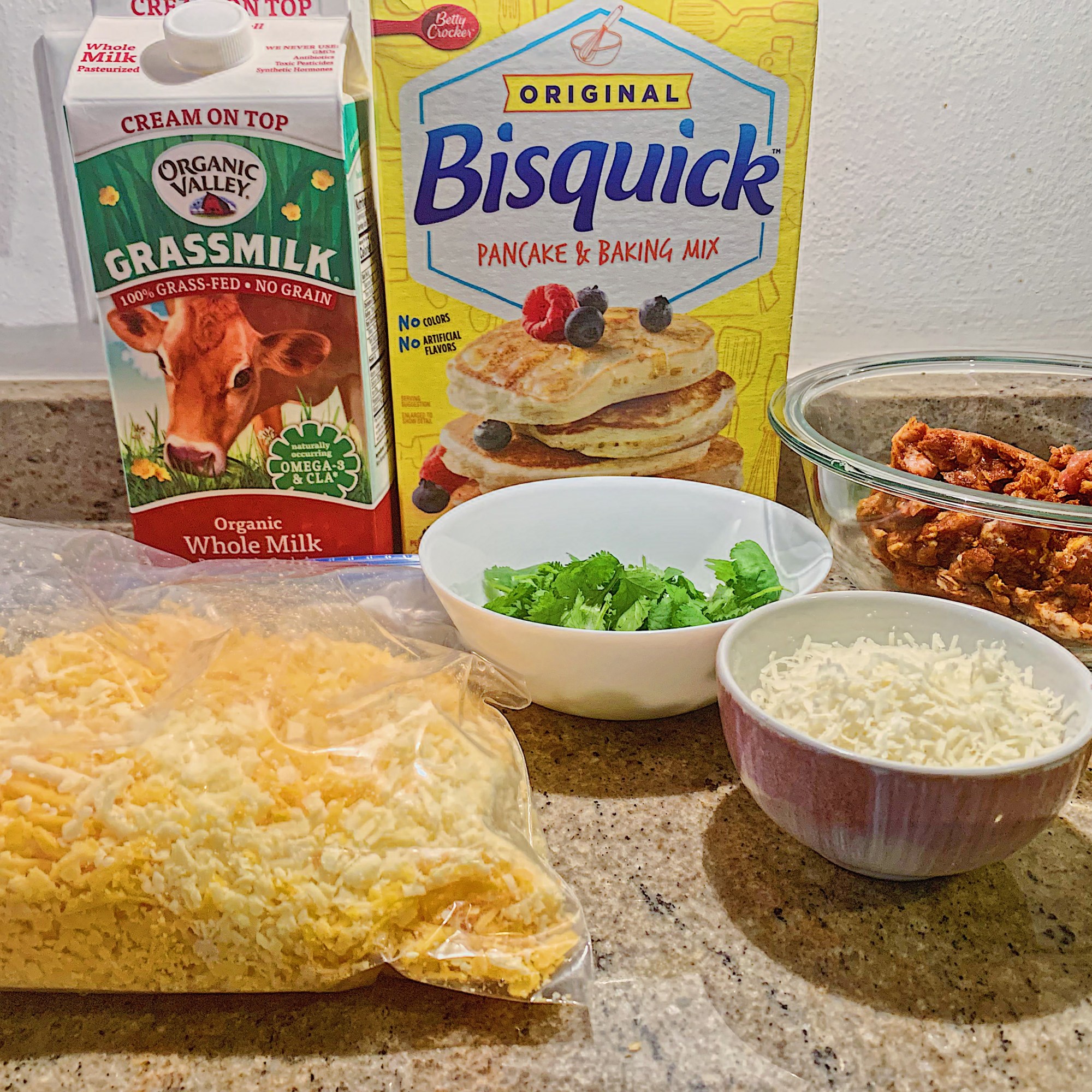 I’d been thinking of this idea for awhile and was excited to incorporate some Mexican flavors. I love Mexican-style fresh chorizo because it’s so boldly seasoned with paprika, cumin and garlic – some of my favorites. I usually eat chorizo in tacos but I thought the flavors would be great in biscuit too. Cilantro is a perfect sidekick and provides some herbal brightness. I kept the cheddar cheese and parmesan cheese because it’s still a dish made with Bisquick so we can relax on finding “authentic” cheeses. Plus, these melt well and are yummy.