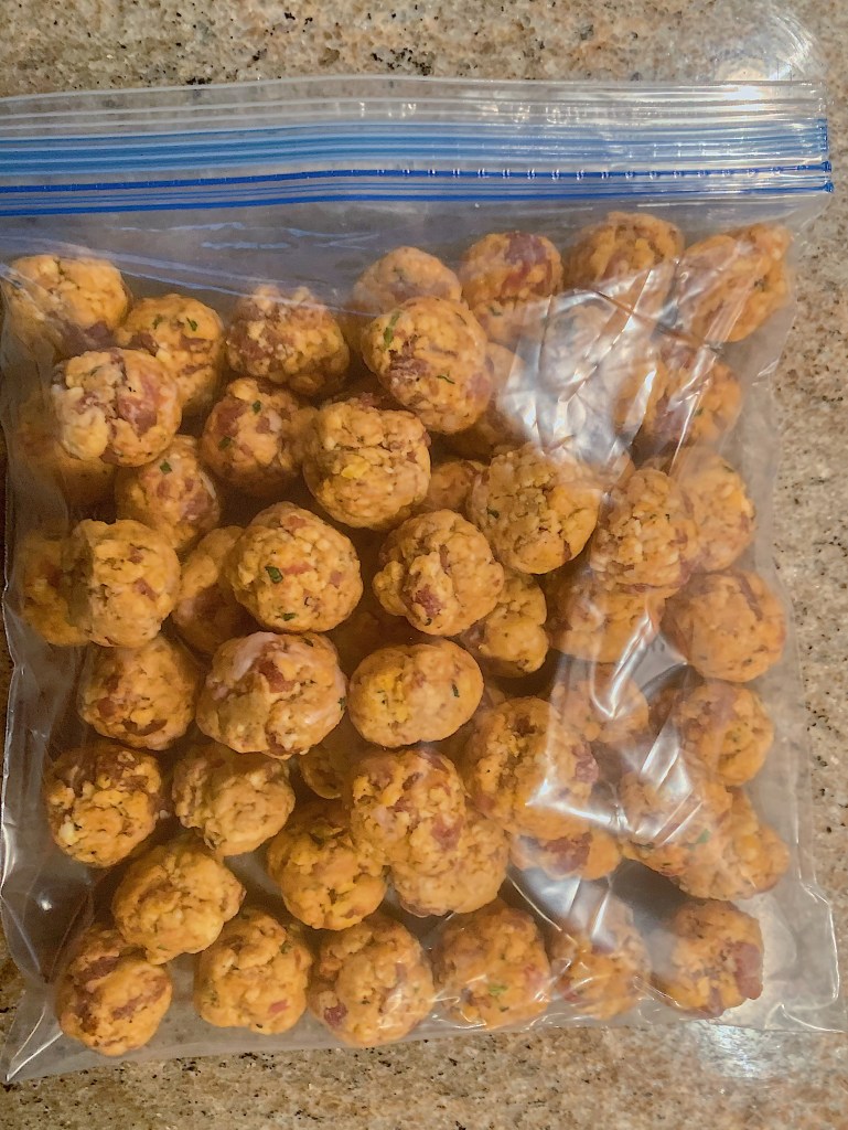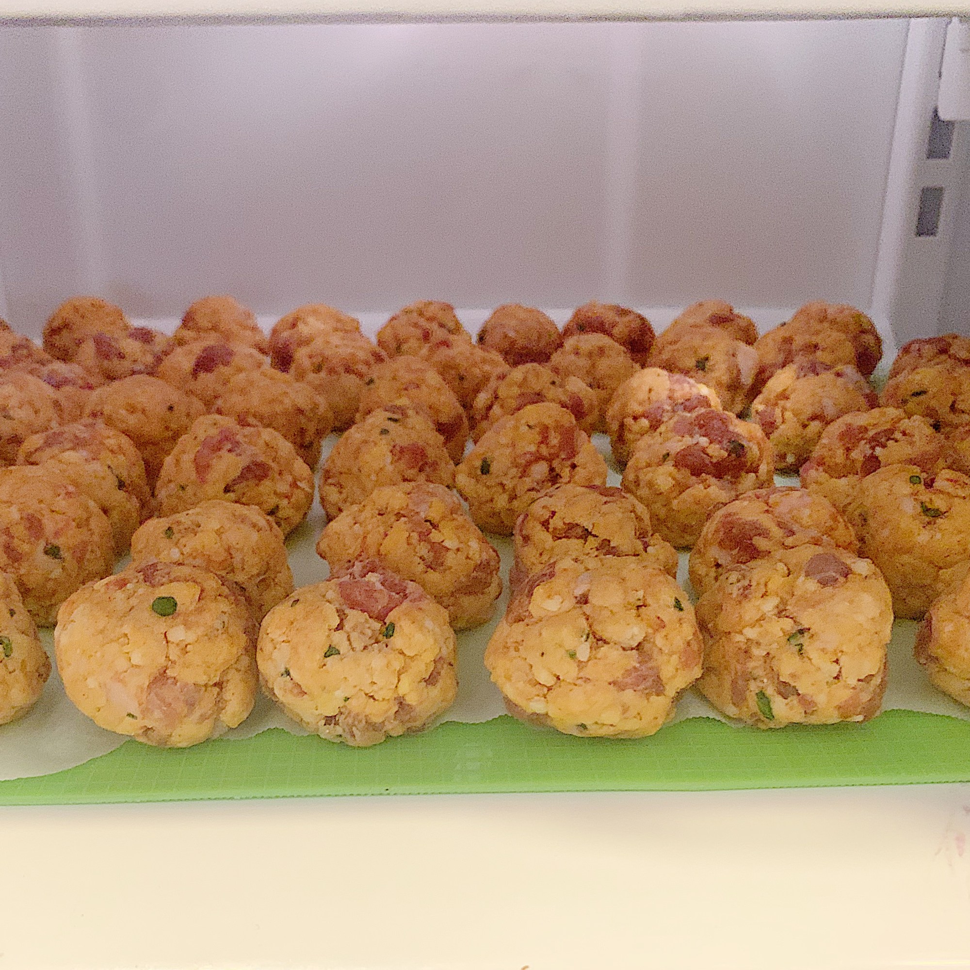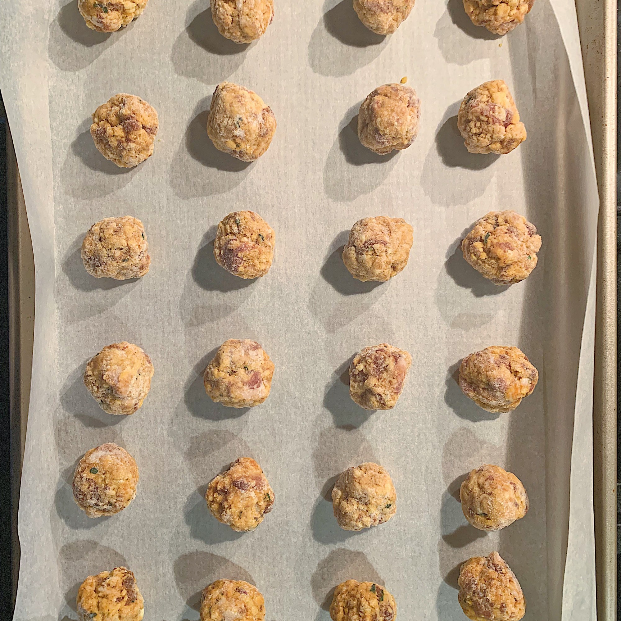 Well, after middle school, my family moved to New Jersey and sausage cheese balls were all but a memory in the land of Taylor ham/pork rolls sandwiches and ubiquitous Italian-American food. Fortunately, I was reunited with this cheesy treat years later when my Texan neighbor made them for the “fancy” college graduation party we threw for our parents. How could I have forgotten! “Never again”, I told myself (ha! probably not that momentous). I’ve been making them for parties ever since.