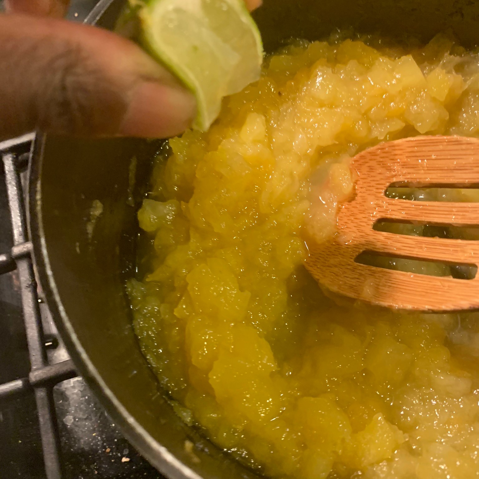 - Remove the lid and let it cook uncovered until it’s thickened to a spoonable consistency (2-5) minutes. Squeeze in the juice of one lime. Stir and let it cool off the heat.