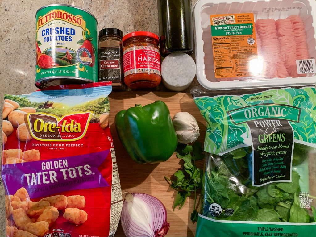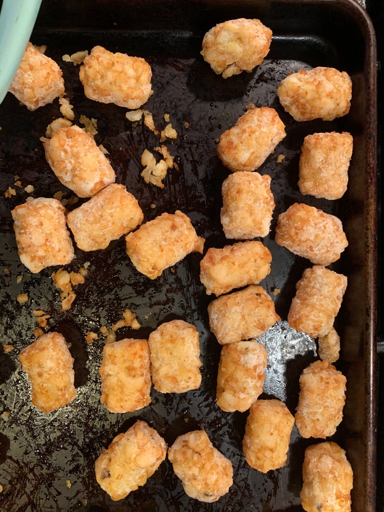 No tots, no problem. The idea is to have a crispy base, so you could use fries, or roasted potatoes instead. Pita chips even. Or-idea Tater Tots (my gold standard) were sold out on a pre-Covid-19 shopping trip, so I bought their round hashbrown discs. That said, I wouldn’t be mad at eating the sauce over rice or on its own like a stew.