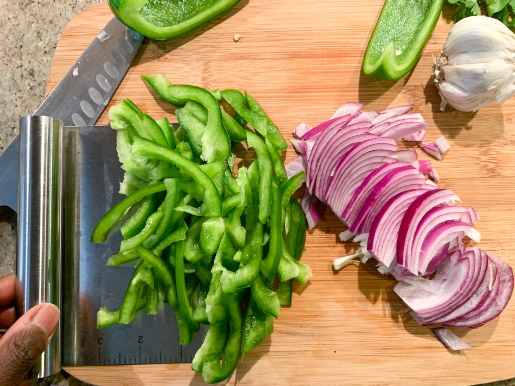 - Preheat the oven to 425 degrees F. Slice the onion in half lengthwise then each half into thin slices. Cut approx. ¾ of the bell pepper into thin slices. You want equal amounts of onion and bell pepper. Finely chop 2 cloves of garlic. (Yay you’re done chopping!)