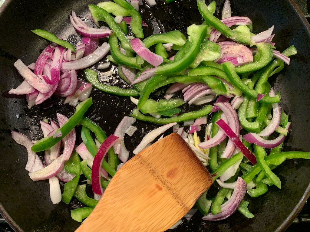 - Add 1 ½ Tbsp of olive oil to the skillet set on medium heat. Add the sliced onion and bell pepper, (but NOT GARLIC) to the skillet and sprinkle on ½ tsp of salt. Cook then stirring and scraping the bottom periodically for 7-10 minutes or until the onions are tender and beginning to brown on the edges. Stir in the chopped garlic and continue mixing for a minute.