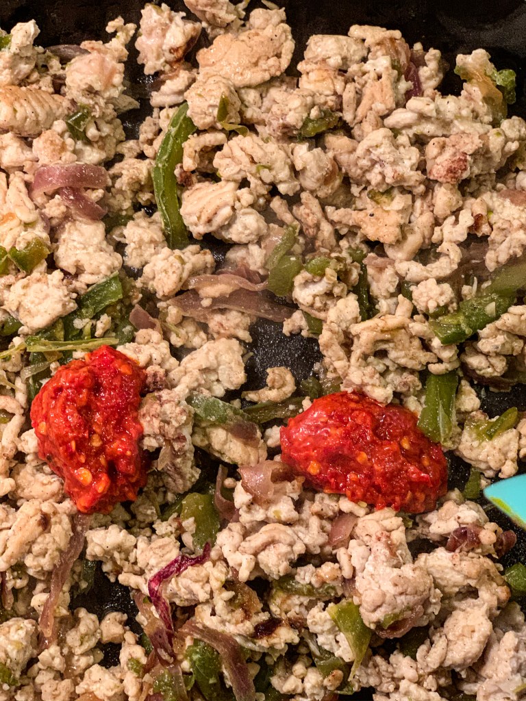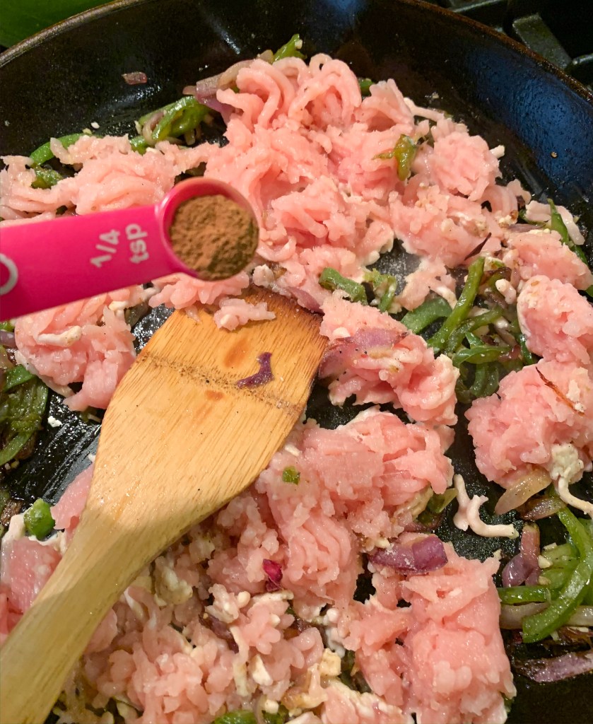 - Add the ground turkey and use the spoon to break it up into small pieces. Sprinkle on another ½ tsp of salt, 1 tsp of sugar and ¼ tsp of cinnamon and continue cooking until the turkey is nearly cooked through. Stir in 2-3 Tbsps of harissa (depending on your spice preferences).