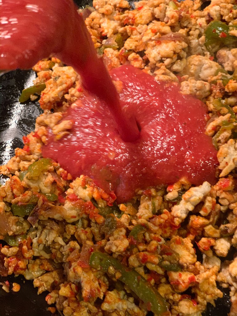 Omit the turkey or swap for a vegan protein of your choice. Vegetarian/vegan protein crumbles are an easy swap. Ground beef or lamb would be great, though you may need to skim off some fat before adding the tomatoes.