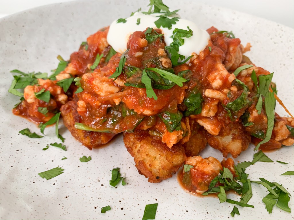I love the combination of something saucy and savory with crispy carbs. This combo is found in many tasty dishes around the world; poutine in Quebec, chilaquiles in Mexico and my new fave, masala fries in Kenya. In my take, I’m combining a North African inspired sauce with good ole American tater tots. I grew up eating tater tots for breakfast, and though they’re not in my regular rotation these days, they are still so good and very comforting IMHO.