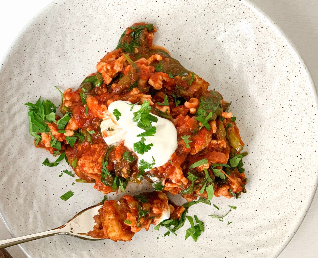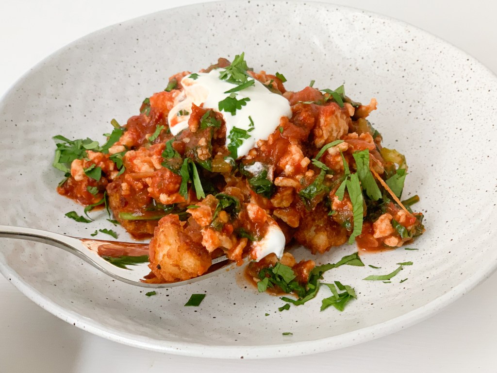Wilting in hearty mixed greens that can stand up to strong flavors legitimizes Saucy Tots as a “one dish” dinner option. We need those veggies! If you’re so inclined, add a dollop of sour cream and sprinkle fresh cilantro when you serve them. The tangy richness of the sour cream and hit of herbs takes the dish to the next level.