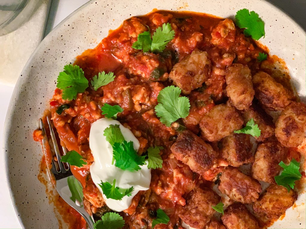 - You can spoon the sauce over the tots right before eating or plate the tots next to the sauce to maximize crispness. Top each serving with a small dollop of sour cream and sprinkle of cilantro if you like. Enjoy!
