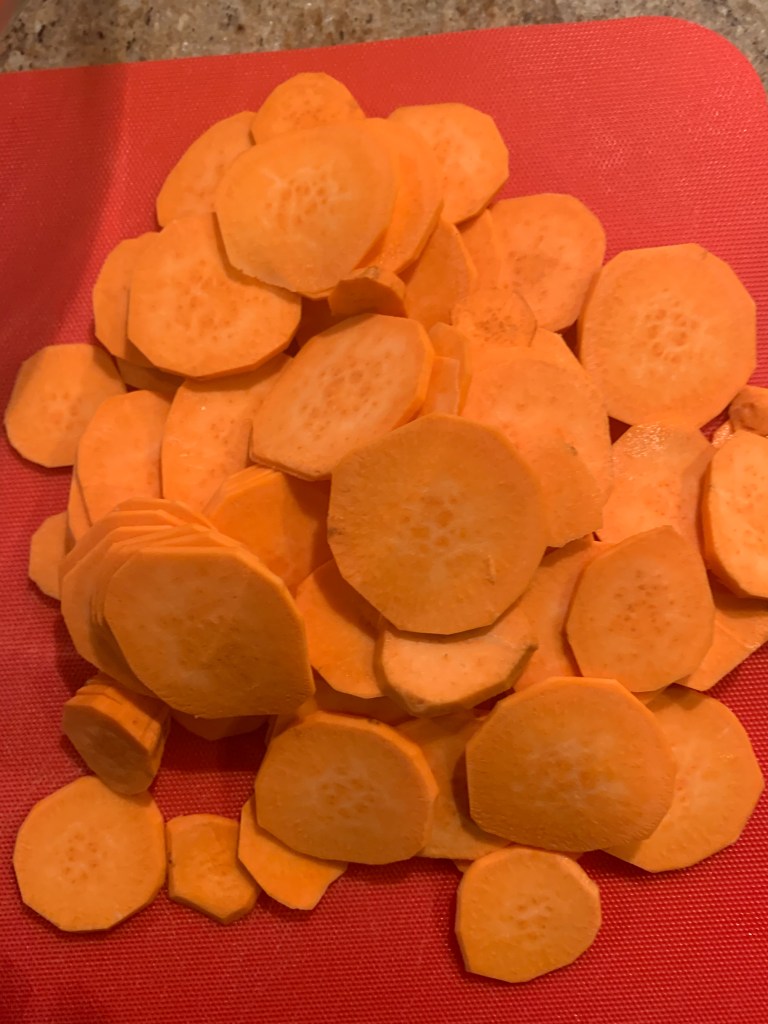 1. Make sure you have an oven rack in the middle position. Preheat your oven to 425°F. Peel the sweet potato. If your sweet potato is greater than 3 inches in diameter, cut it in half lengthwise. Thinly slice the sweet potato (approx 1/8th inch thick).