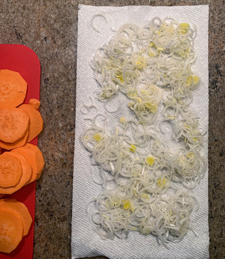 2. Thinly slice the leek or shallots. You’ll need ⅓ a cup. If you’re using shallots, you can skip to the next step. Submerge the leek slices in a bowl of water and swish them around for a minute to wash off any sand. Just rinsing the leek will not be enough, trust me! Scoop the leeks from the water and drain them on paper towels or a kitchen towel.