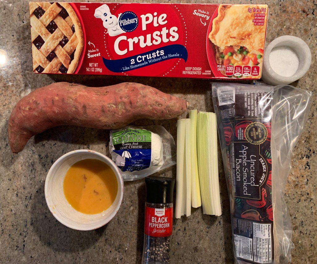 Most savory galette recipes require pre-cooking the vegetables and meat before assembling and baking the pastry. I wasn’t trying to do that, so I looked for ways around it. Thinly slicing the sweet potatoes and arranging them in single layers with the other ingredients helps them cook evenly. The bacon is thinly sliced as well but placed only on the top layer so it has the most exposure to heat and can crisp nicely. A bonus is that all of the bacon drippings flavor the layers below. Yum! Lastly, the unusual step of covering the pie and whole baking tray with foil for most of time in the oven retains more heat and creates a bit of steam. This give the filling more time to cook without over browning the crust.