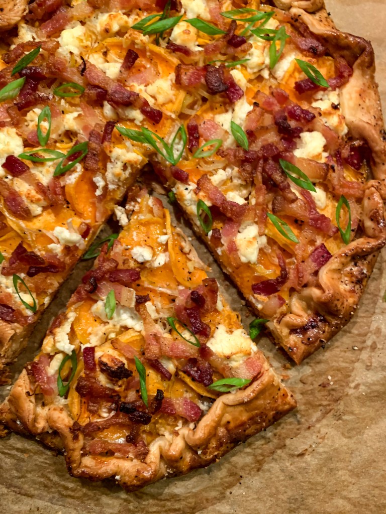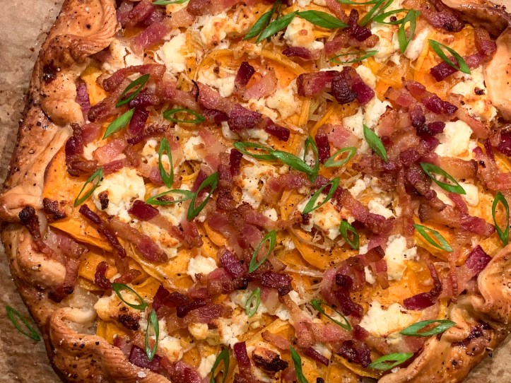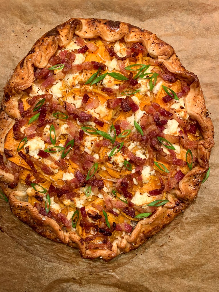 This free form tart is for all of us savory pastry lovers…and bacon lovers. Oh yes, sweet potato fans, it’s for you too. Basically, there’s a lot to like here with crispy bacon, tangy goat cheese and tender sweet potatoes in one cozy crust. Despite the fancy name, galette’s can be much easier to make than traditional American pies. You don’t need Instagram-worthy pie crust working skills and I figured out how to avoid precooking ingredients. Lazy-ish cooks rejoice!