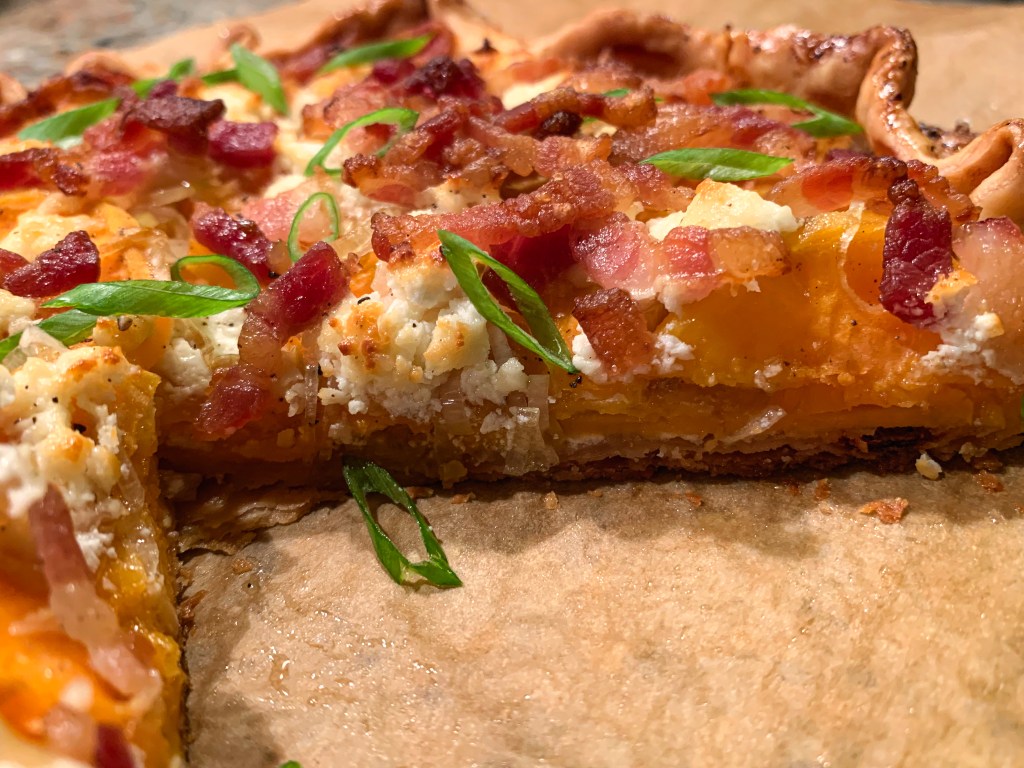 8. The galette is done when sweet potatoes are tender (can easily pierce with a fork), and the bacon is cooked through. At this point the filling should be bubbling a bit. In the case that the crust is browned before filling is done, you can use strips to lightly cover just the crust for the remainder of the baking time. Once the galette is done, let it cool at least 10 minutes before serving. Feel free to top with sliced green onions or chives right before serving. Enjoy!