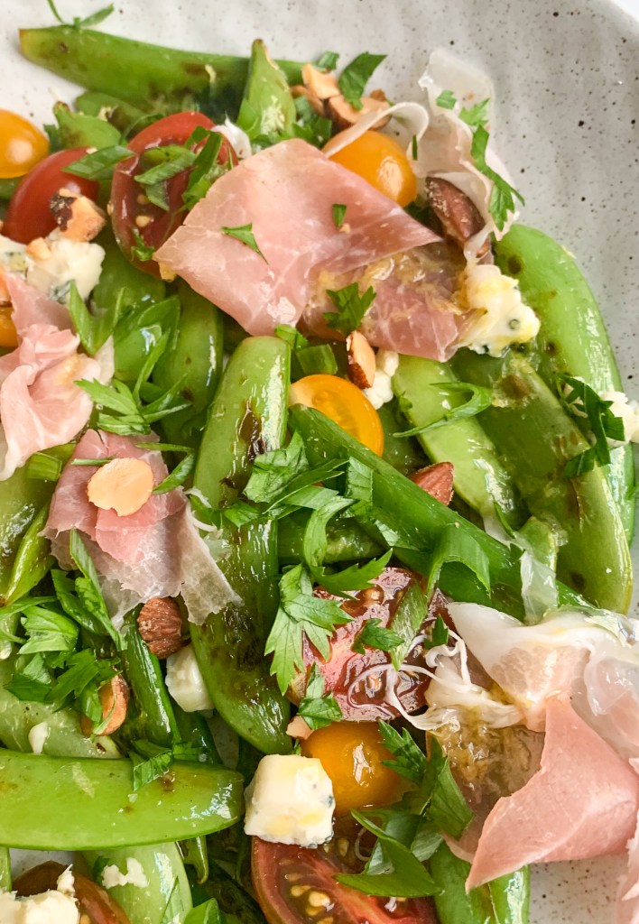 - Assemble the salad: Transfer the sugar snap peas to a serving platter. Sprinkle a generous pinch of salt over the peas, then top them with the tomatoes, scallions, cheese and herbs. Mix the dressing with the fork and drizzle it over the salad. Sprinkle on the chopped almonds. If you’re using prosciutto, you can tear the slices into pieces and nestle them around the salad.